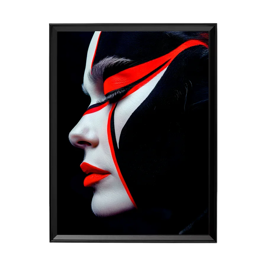 En la quietud de la noche, donde los secretos se revelan y la intensidad se apodera del ambiente, surge "Máscara de Medianoche". Este cuadro es una poderosa exploración del contraste, presentando un perfil femenino elegantemente adornado con trazos audaces de negro y rojo vibrante sobre una base blanca luminosa. La composición minimalista y la intensidad de los colores crean un impacto visual inmediato y sofisticado.